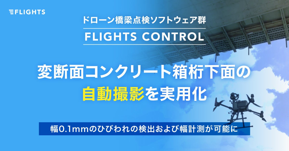 株式会社FLIGHTS(本社:東京都渋谷区、代表取締役:峠下 周平)と、大日本ダイヤコンサルタント株式会社(本社:東京都千代田区、代表取締役社長:原田 政彦)は、ドローン橋梁点検ソフトウェア群「FLIGHTS CONTROL」(※1)の新機能として、変断面コンクリート箱桁下面に対する自動飛行撮影の実用化が完了したことをお知らせします。