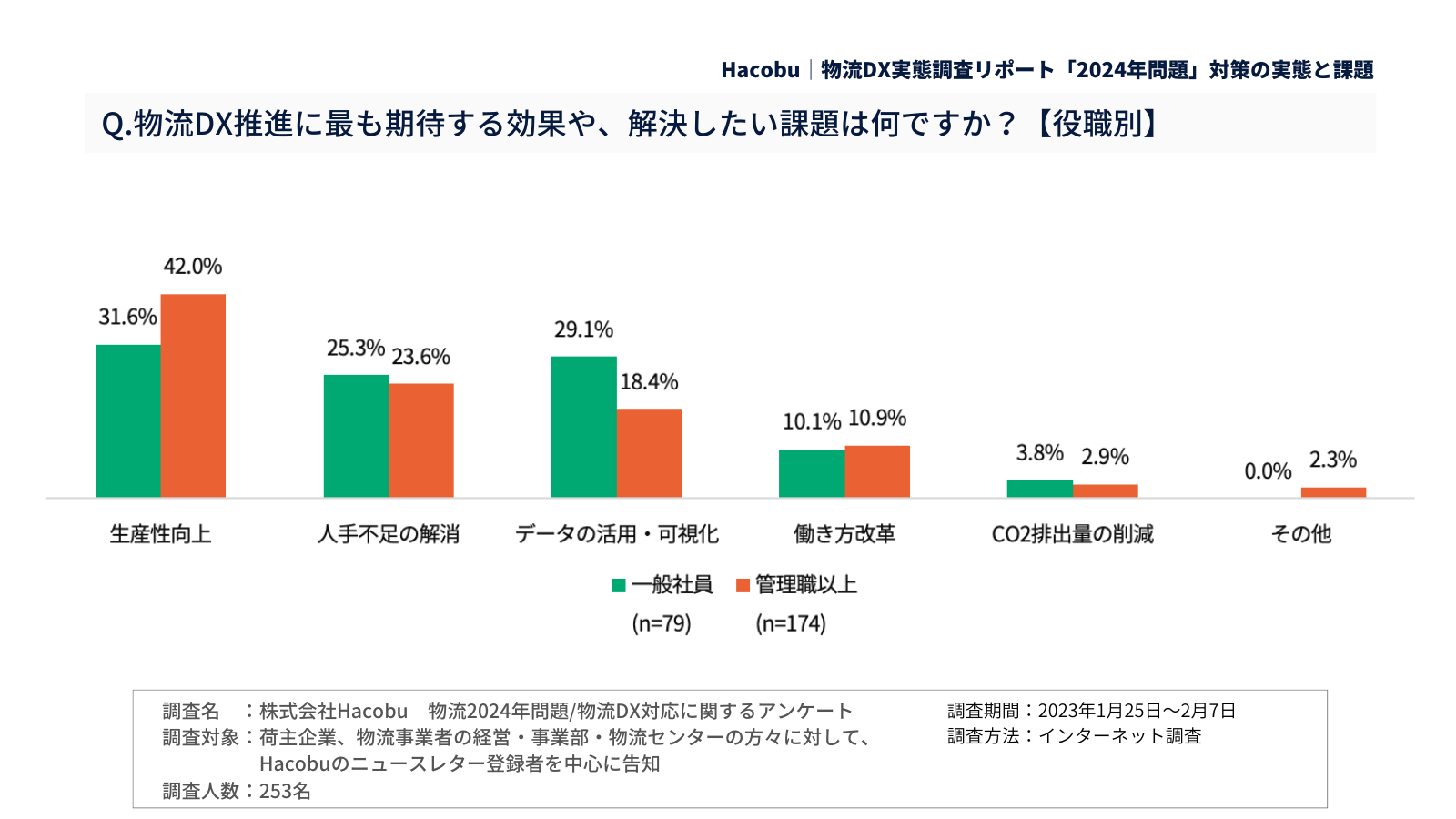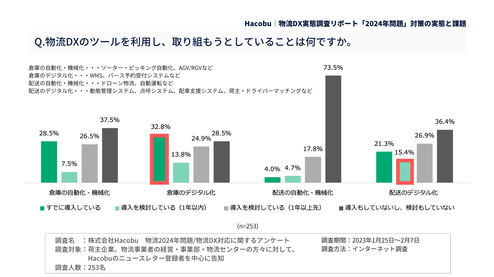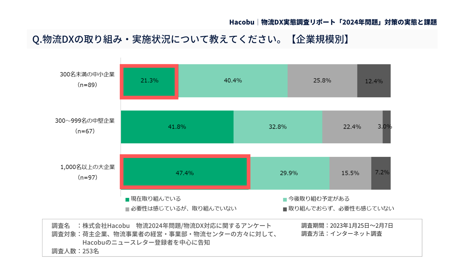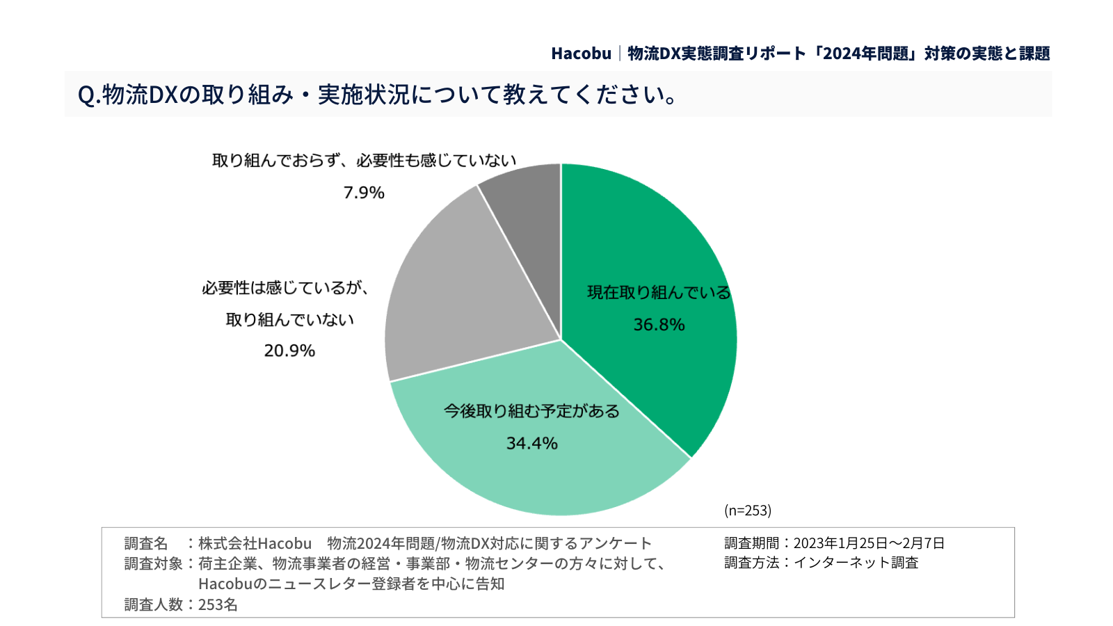 「運ぶを最適化する」をミッションに掲げる株式会社Hacobu(ハコブ、本社:東京都港区、代表取締役社長CEO 佐々木太郎、以下「Hacobu」)は、物流領域に関連する荷主企業及び物流事業者の経営、事業部、物流センターの方々を対象に、2023年2月、物流DXの取り組み状況に関する調査を実施しました。この度、その調査結果について『物流DX実態調査リポート〜「2024年問題」対策の実態と課題』にまとめましたので、お知らせします。