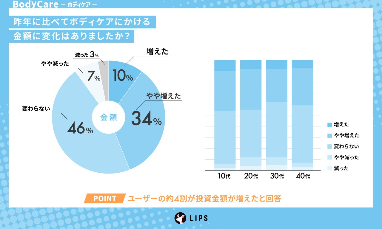 「昨年に比べてボディケアにかける金額に変化がありましたか?」という質問に対して、「増えた」(増えた・やや増えた)と回答した人は4割超という結果に。LIPS編集部の予想通り、ヘアケア同様、ボディケアでも昨年と比較し、投資する金額が増えたことが分かりました。