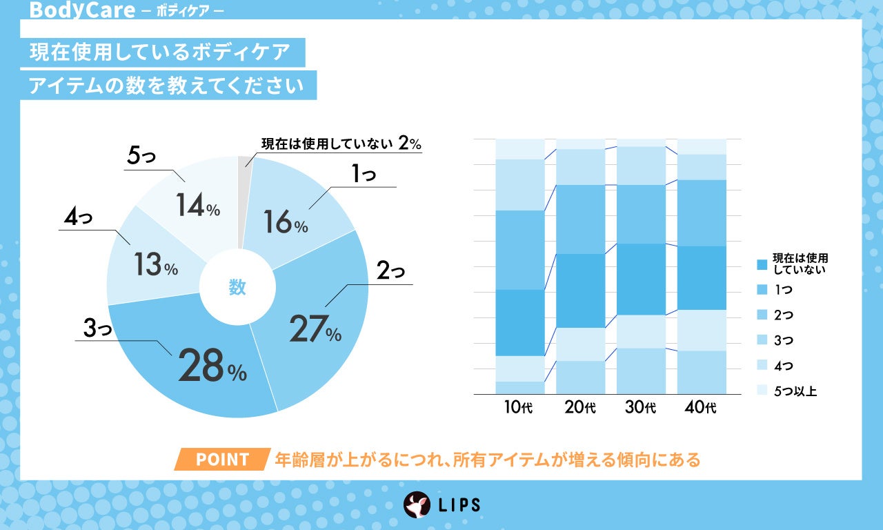 最後に、現在使用しているボディケアアイテムについて深掘りしていきます。現在使用しているアイテム数については、「3つ」使用している方が28%、「2つ」使用している方が27%という結果に。