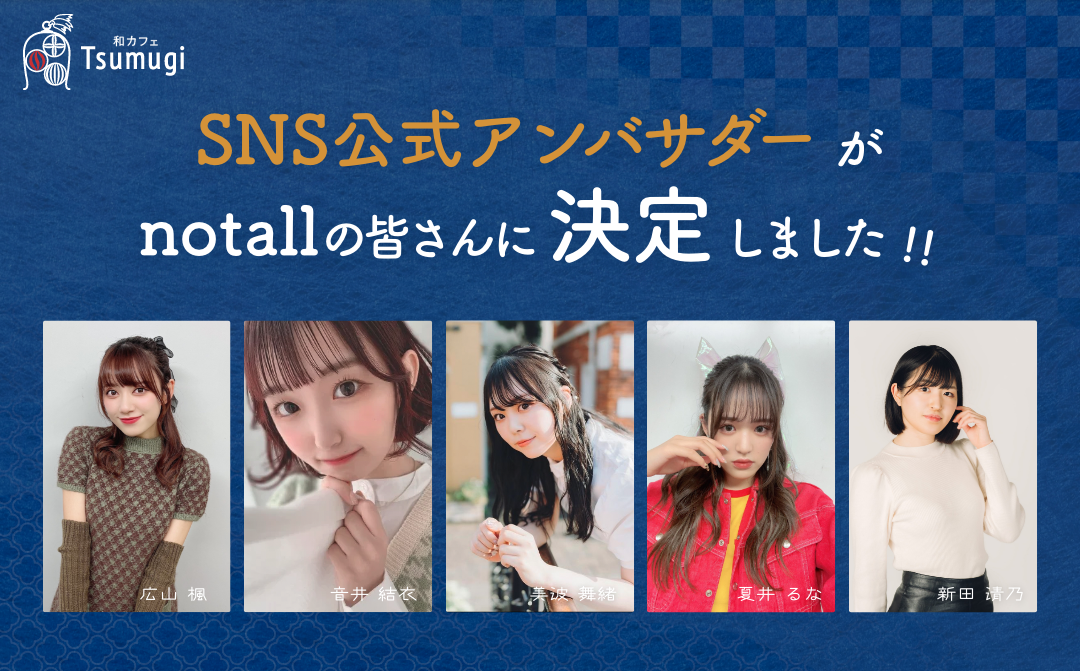 株式会社プロントコーポレーション(本社:東京都港区、代表取締役社長:竹村典彦)が展開する「和カフェ Tsumugi(ツムギ)」は、アイドルグループ「notall(ノタル)」を和カフェ Tsumugi SNS公式アンバサダーに起用することを決定いたしました。今後は、和カフェ Tsumugi に関する最新情報をSNS公式アンバサダーのメンバーがお届けいたします。
