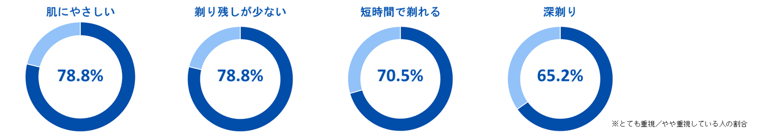フィリップスが日本国内で2,000名の男性を対象に行った調査[5]では、30歳~59歳までの世代では「深剃り」のニーズが最も多かったのに対し、18歳~29歳までの世代では「肌へのやさしさ」が最も多く、次いで「剃り残しが少ない」、「短時間で剃れる」というニーズが多いことが分かりました。