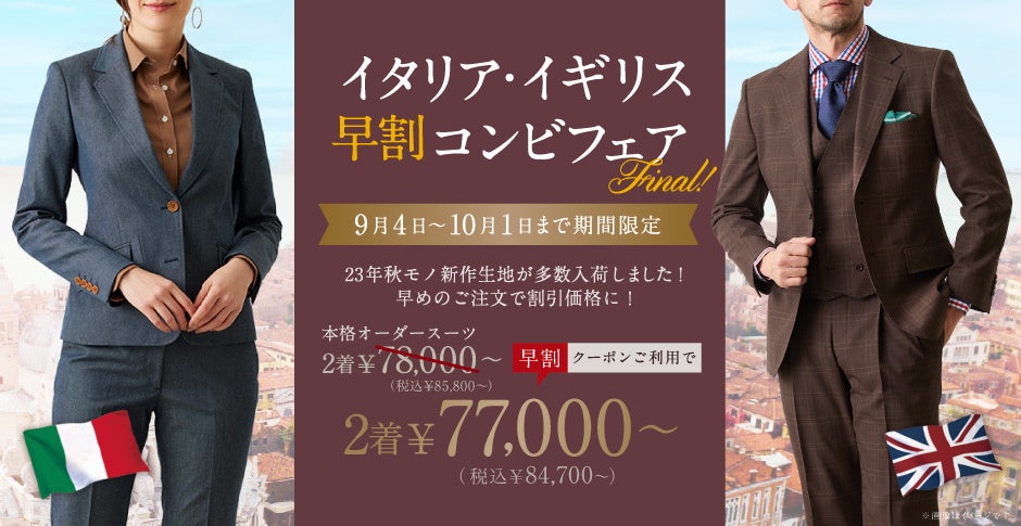 ※コンビ価格・・・オーダースーツ2着以上ご購入していただいた場合の1着あたりのお値段です。組み合わせは自由ですので、異なる価格帯のオーダースーツと組み合わせていただいても本価格が適用されます。