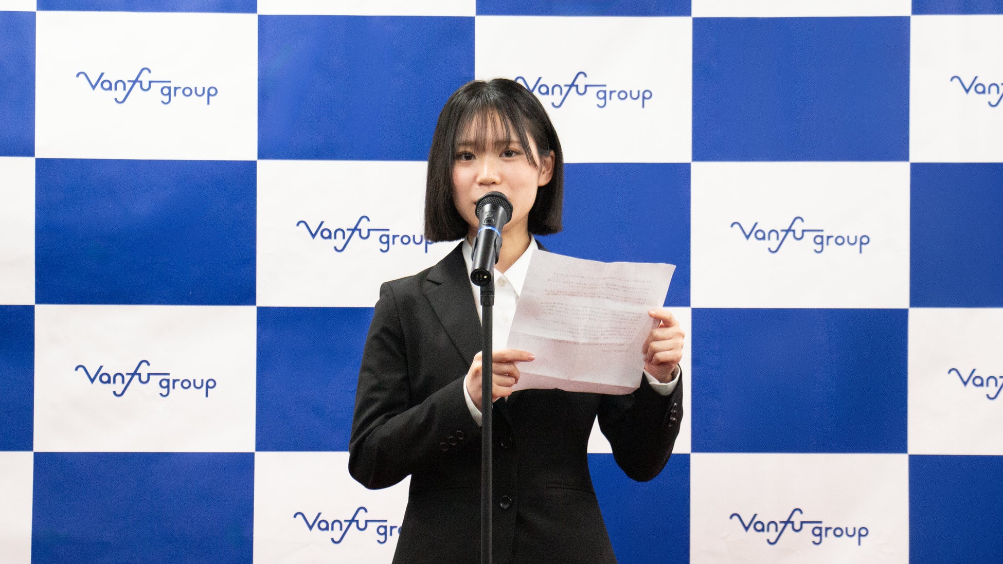 続いて、新入社員代表挨拶では「お客様にワクワクしていただける仕事ができるよう、まずは元気に挨拶することを心がけ、今の自分たちにできることから精一杯取り組んでいくことをここに誓います。一日も早くバンフーグループで活躍できるよう、常に学ぶ姿勢と向上心を持って仕事に励みます。」と述べ、今後の成長への意欲を語りました。