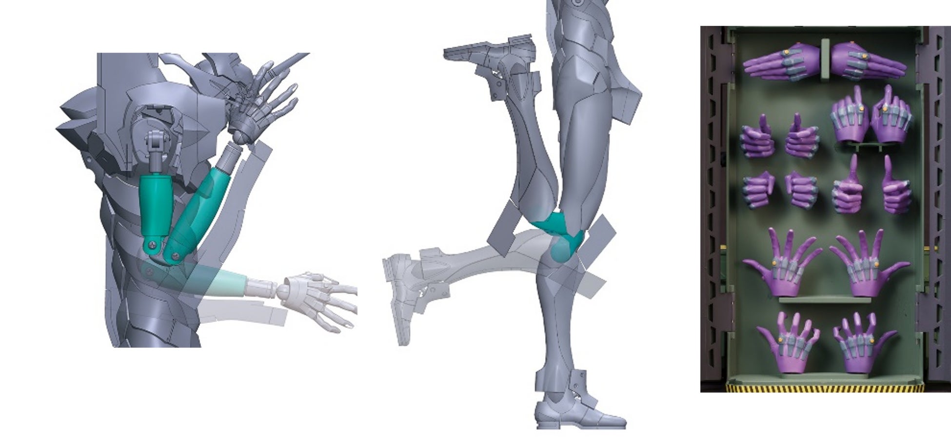 劇中のポージングを再現するために首や手首、股関節などの可動化を実現。口や手などを換装パーツに差し替えることで武器を持ち換えたり、多彩なポージングを楽しむことができる。