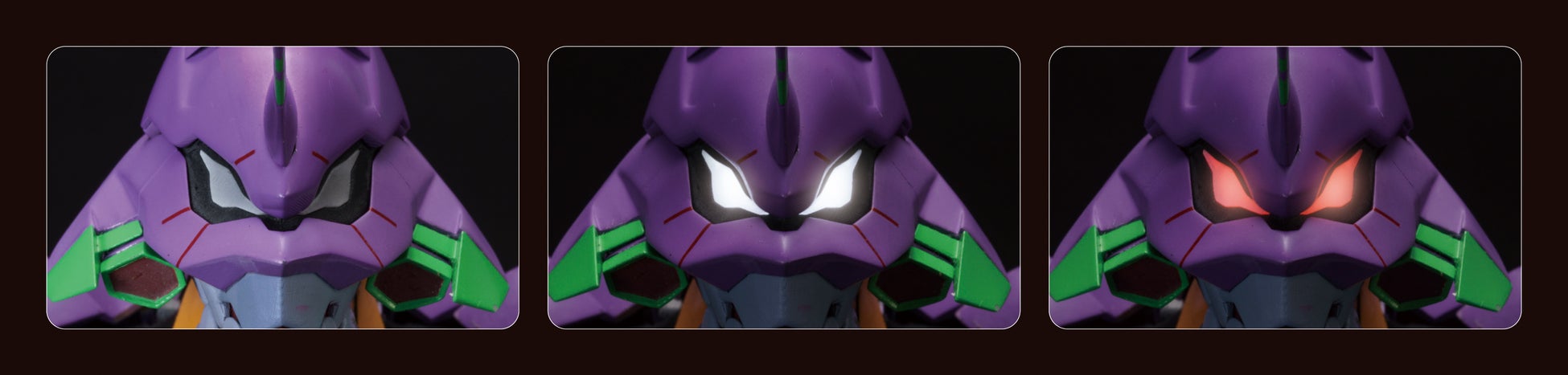 眼は白色と赤色の2色で発光。エヴァ初号機の起動時と暴走時をイメージしている。リモコン操作で簡単に切り替えることができる。