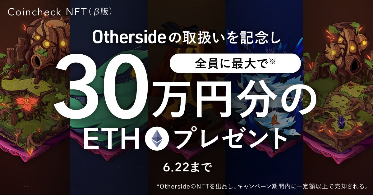 コインチェック株式会社の提供するNFTマーケットプレイス「Coincheck NFT(β版)」では、『Otherside』の土地「Otherdeed(NFT)」の取扱いを本日より開始しました。本取扱い開始を記念し、最大で30万円相当のETHがもらえるキャンペーンを本日より開催します。