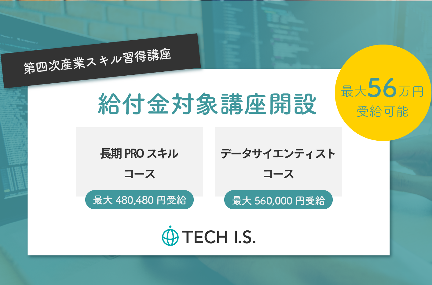 プログラミングスクール事業を手掛ける株式会社テックアイエス(本社:東京都目黒区、取締役社長:植松 洋平、以下「テックアイエス」)の「長期PROスキルコース」「データサイエンティストコース」が経済産業大臣認定の第四次産業革命スキル習得講座、厚生労働省指定の教育訓練給付制度の対象講座として認定されました。2022年4月1日以降に受講開始するコースが本講座の対象となり、諸条件を満たすことで受講料の最大70%(最大給付額56万円)が助成されます。