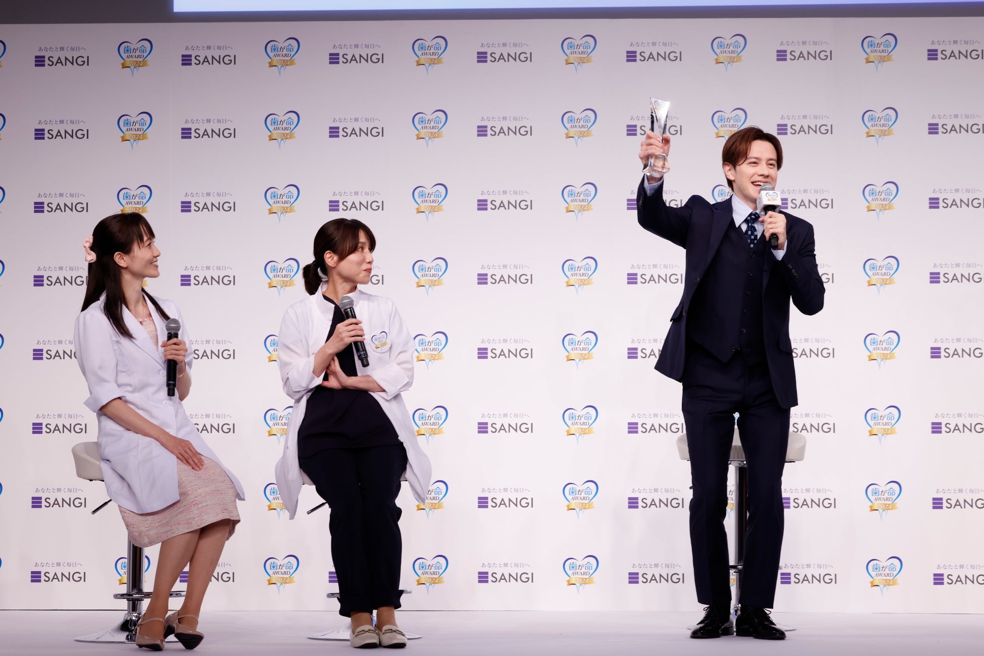 美白高機能歯みがき売上No.1*シリーズ「アパガード」を展開する株式会社サンギ(本社:東京都中央区築地、 代表取締役社長:ロズリン・ヘイマン)は、8月1日の「歯が命の日」を記念して、第10回目となる『サンギ 歯が命アワード2024』の表彰式を7月30日(火)にEBiS303イベントホールにて開催いたしました。2024年は、タレント・俳優・MCなど幅広い活躍で、いつも明るく輝く笑顔でお茶の間に『元気』を届けてくれる、ウエンツ瑛⼠さんに同アワードを贈り、トロフィーを授与いたしました。