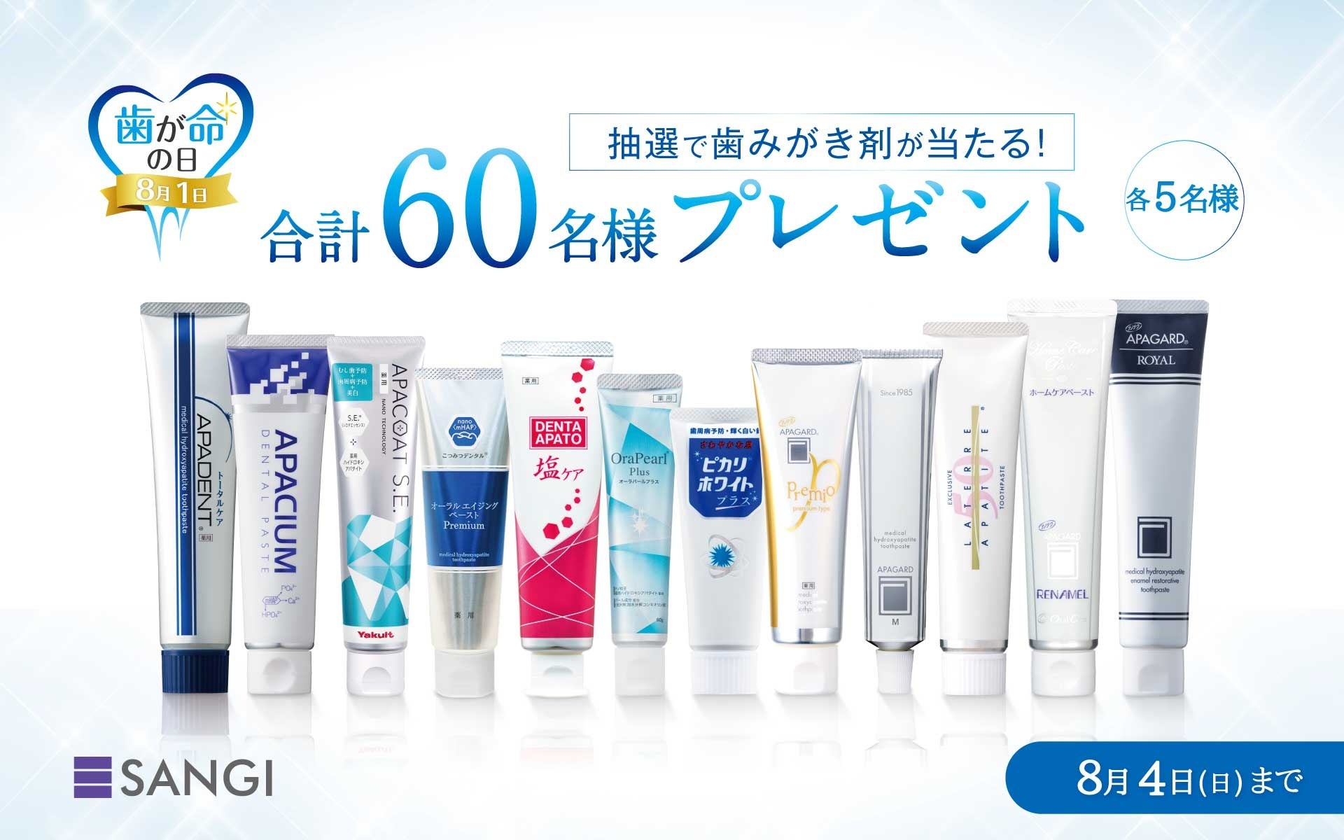 サンギ開発のむし歯予防成分「薬用ハイドロキシアパタイト」配合の歯みがき剤が60名様に当たるプレゼントキャンペーンを2024年7月2日(火)~8月4日(日)にて実施しています。