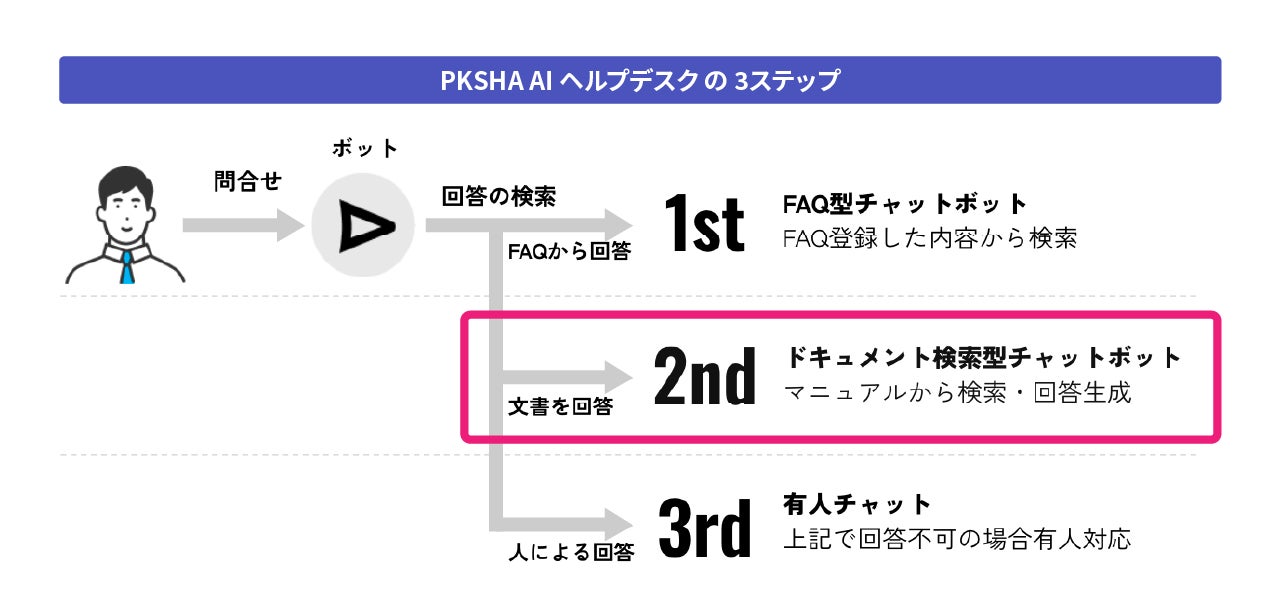 (1st) FAQ回答 (2nd)ドキュメントからの回答(今回) (3rd)人による対応、の3ステップの動線により解決率向上