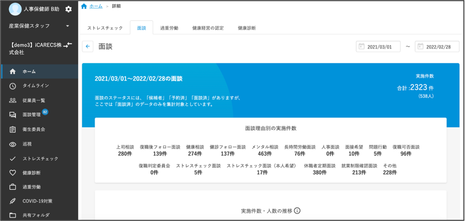 ▼Carelyの管理画面より、面談の総件数と理由別の実施件数を表示