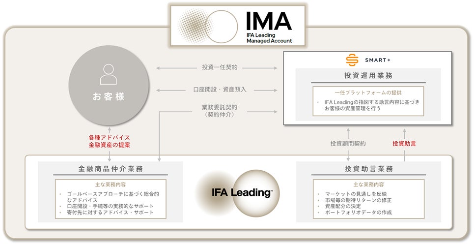 IFA Leadingは、「新たな”お金の循環”から生まれる豊かな世界の実現」をビジョンに掲げ、日本の金融サービスの変革を目指して2022年6月に設立した独立系ファイナンシャルアドバイザー(IFA)法人です。サービス提供開始から約2年となる2024年5月時点で仲介する総預かり資産は400億円を突破。金融サービスの提供にあたり、資産運用における「透明性」を最も重要視し、日本ではまだ発展途上である「残高連動型のフィーモデル」を採用しているほか、資産形成を長期的に支援するため、資産運用のプロフェッショナルがお客様の潜在的なゴールを共に導き出す「ゴール・ベース・アプローチ」を実践。これを実現するために最適なソリューションを追求し証券や保険、不動産など資産全般に関わるアドバイスと商品の媒介、運用後のサポートを生涯にわたって提供します。
