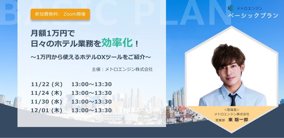 宿泊施設向けレベニューマネジメントツール『メトロエンジン』を提供し、DX化や集客支援を行うメトロエンジン株式会社(本社:東京都品川区、代表取締役CEO:田中良介、以下メトロエンジン)が、11月22日(火)、24日(木)、30日(水)、12月1日(木)の4日程でセミナーを開催し、競合宿泊施設や自社施設の調査・分析に役立つツールをご紹介します。