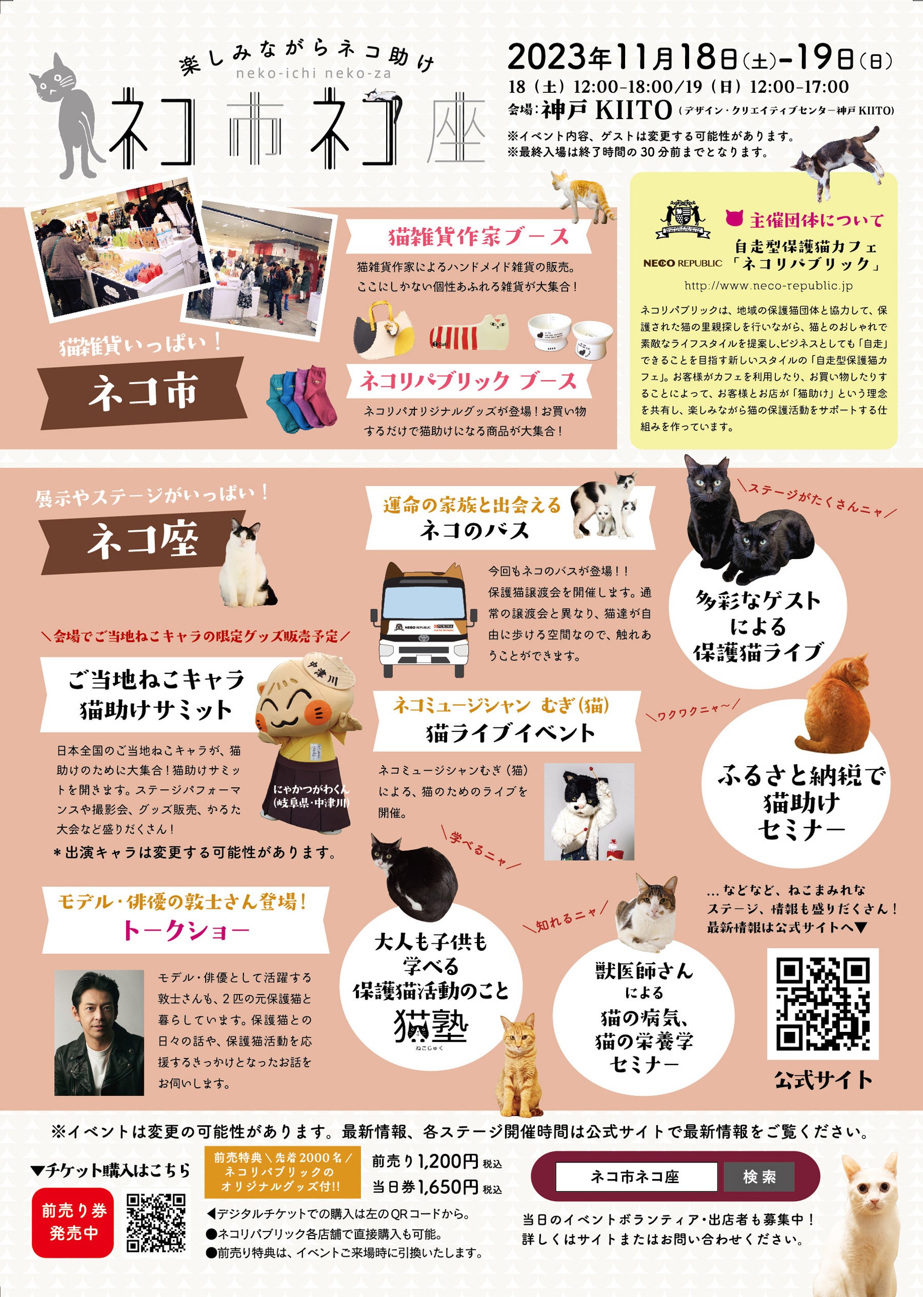 保護猫カフェを全国で13拠点運営するネコリパブリック主催。猫好きも猫に興味がない人も、猫嫌いな人までも楽しめる、猫が助かる猫祭り「ネコ市ネコ座」を、2023年11月18日19日神戸にて盛大に開催します