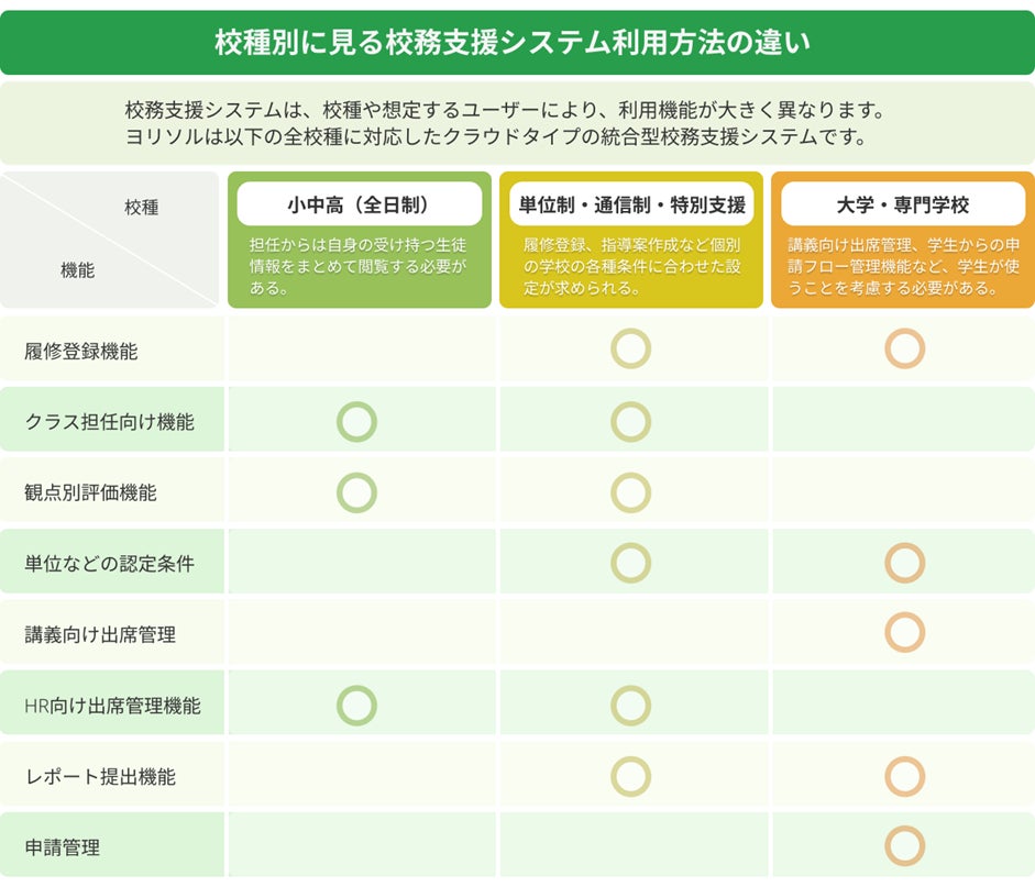 これまでヨリソルでは、高等教育機関向けに成績管理、履修登録機能を提供していましたが、この度のバージョンアップにより、高等教育機関だけでなく初等中等教育までを幅広くカバー可能とするほか、単位制を導入している公立学校でも柔軟に活用いただけます。