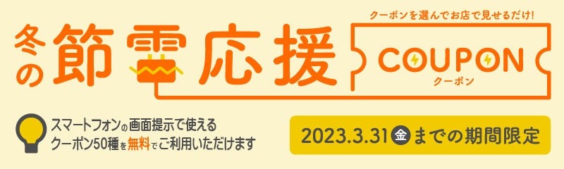 「冬の節電応援クーポン」は、関西電力が“はぴeみる電”WEBサイト上に掲載したグルメや日帰り湯などの本クーポンを、会員さまが日常的にご利用いただき外出機会を増やすことで、在宅時間の軽減による節電を目的として推進しております。