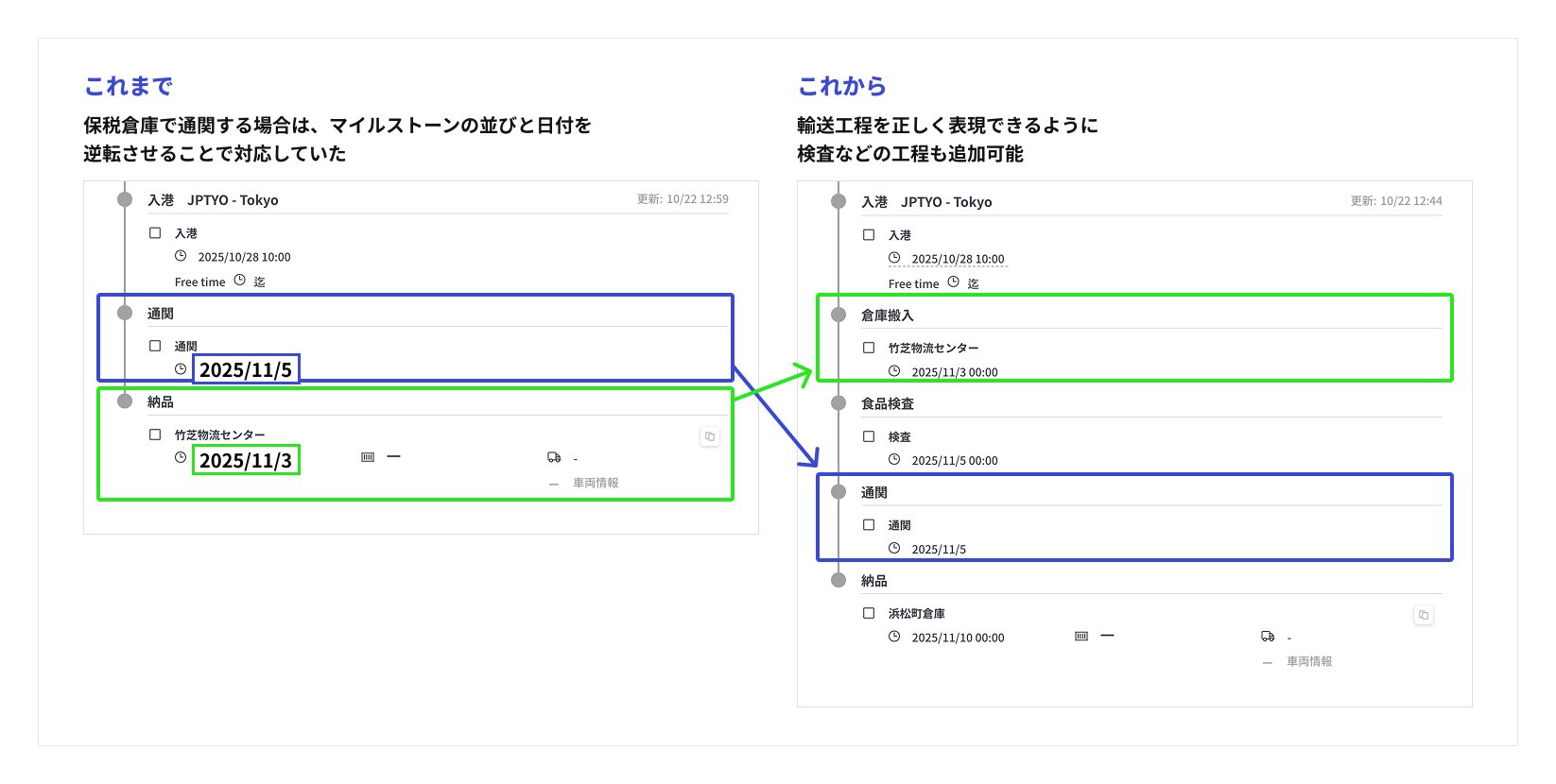 この度の機能拡充により、柔軟なマイルストーン設定や順序のカスタマイズが可能となり、イレギュラーなケースも含め輸送の段階をより詳細・正確に一元管理できるようになりました。