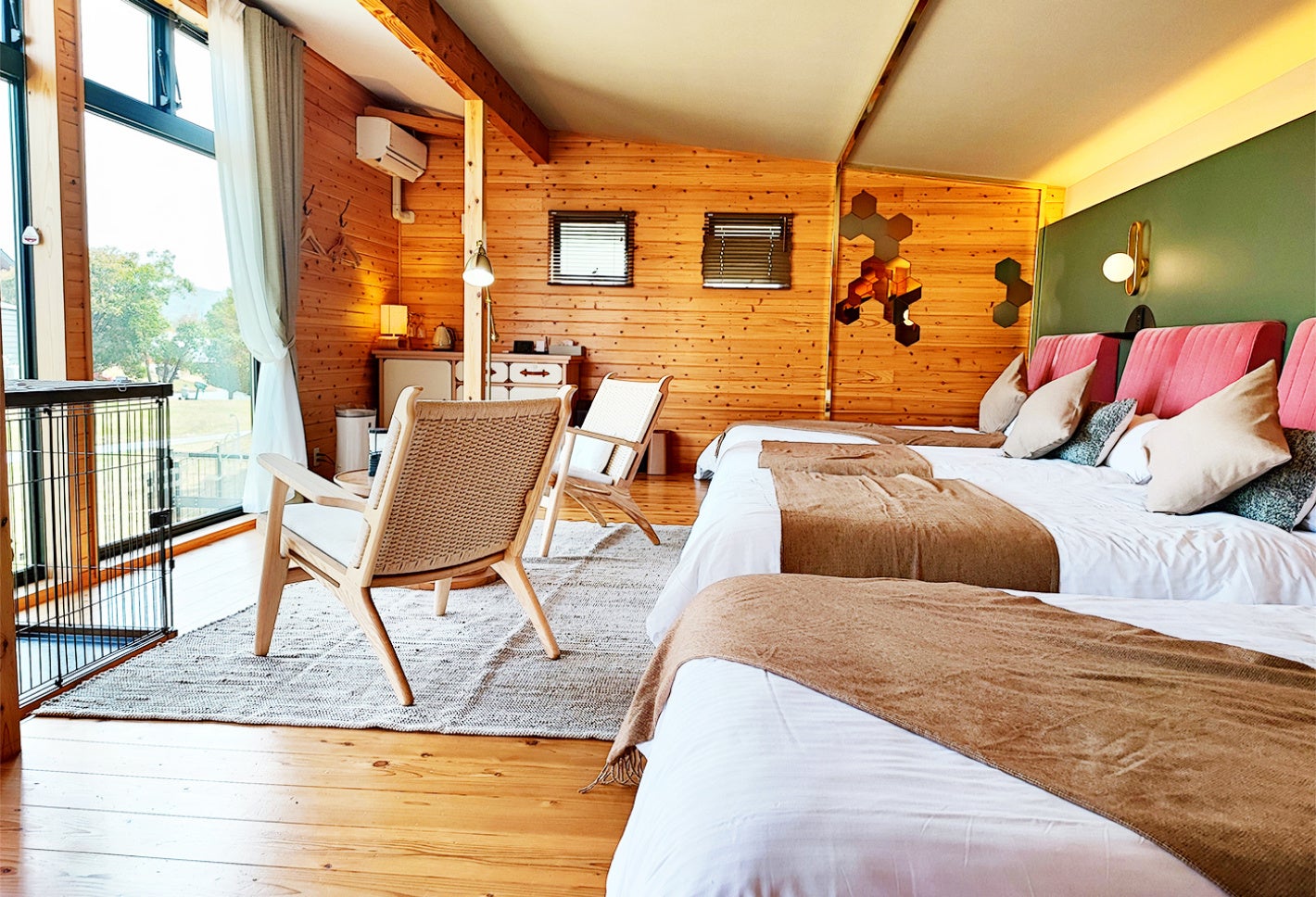 ドッググランピングでお泊りいただけるのは、コンセプトの異なる2つのお部屋「For_dog Room SOL」(ソル)&「For_dog Room FLAMMA」(フランマ)。自分の好みに合わせて「愛犬と一緒に」好きなデザインのお部屋をお選びいただけます。
