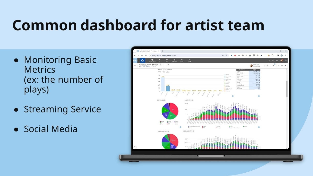 近年、ストリーミングサービスによって旧譜の楽曲が広く聞かれるようになり、インフルエンサーが旧譜をSNSで紹介する機会が増えました。また、予期せぬUGC(※4)が生まれることで、旧譜の再生回数が急速に増加するケースが起こっています。エイベックスには10数万の旧譜があり、この絶好のタイミングを捉えてプロモーション施策を打ちたいと考えていましたが、新譜のマーケティング活動を行いながら、旧譜の動向をモニタリングすることは容易ではありませんでした。