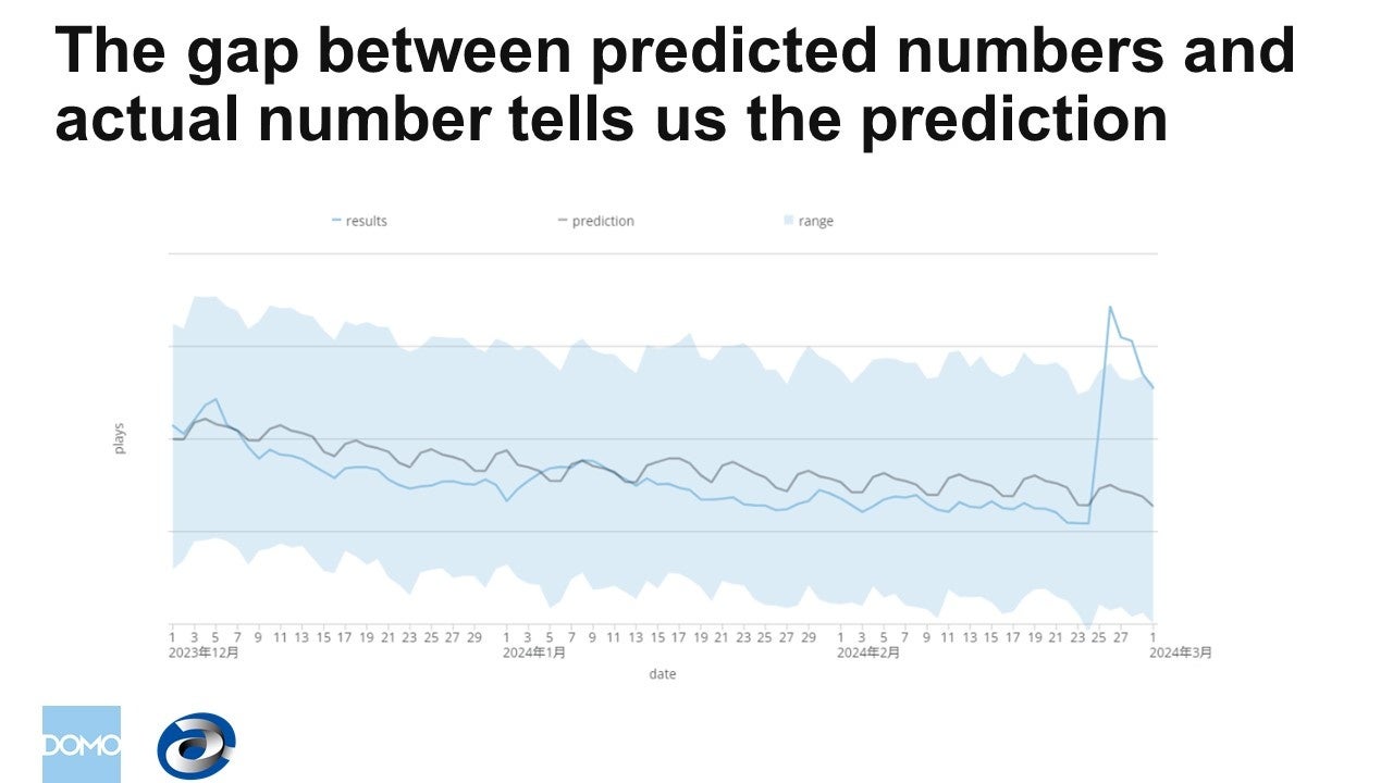 そこで同社はDomo.AIを戦略的に活用して、この課題の解決に取り組んでいます。具体的には、「バズり」の予兆を検知するために旧譜の再生数を予測し、実際の再生数との差異を見ることで「バズり」の予兆を検知しています。このようにAI予測モデルを活用して予兆を検知することで、アクションにつなげています。