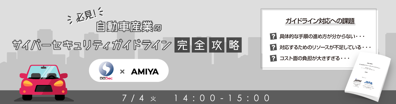 なお、今回の協業により提供を開始する「自動車部品業界向け情報セキュリティ対策支援サービス」について、より詳細をご案内する無料オンラインセミナー『必見!自動車産業のサイバーセキュリティガイドライン完全攻略』の開催も決定しました。