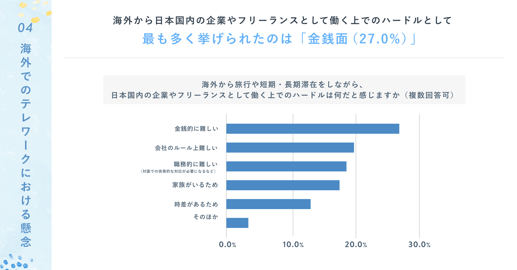 - 海外から日本国内の企業やフリーランスとして働く上でのハードルとして最も多く挙げられたのは「金銭面(27.0%)」