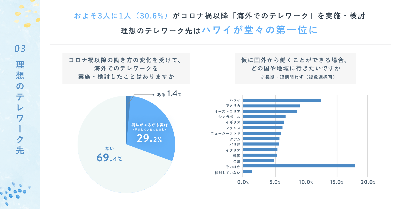 - およそ3人に1人(30.6%)がコロナ禍以降「海外でのテレワーク」を実施・検討 人気の滞在先はアメリカ本土とハワイ
