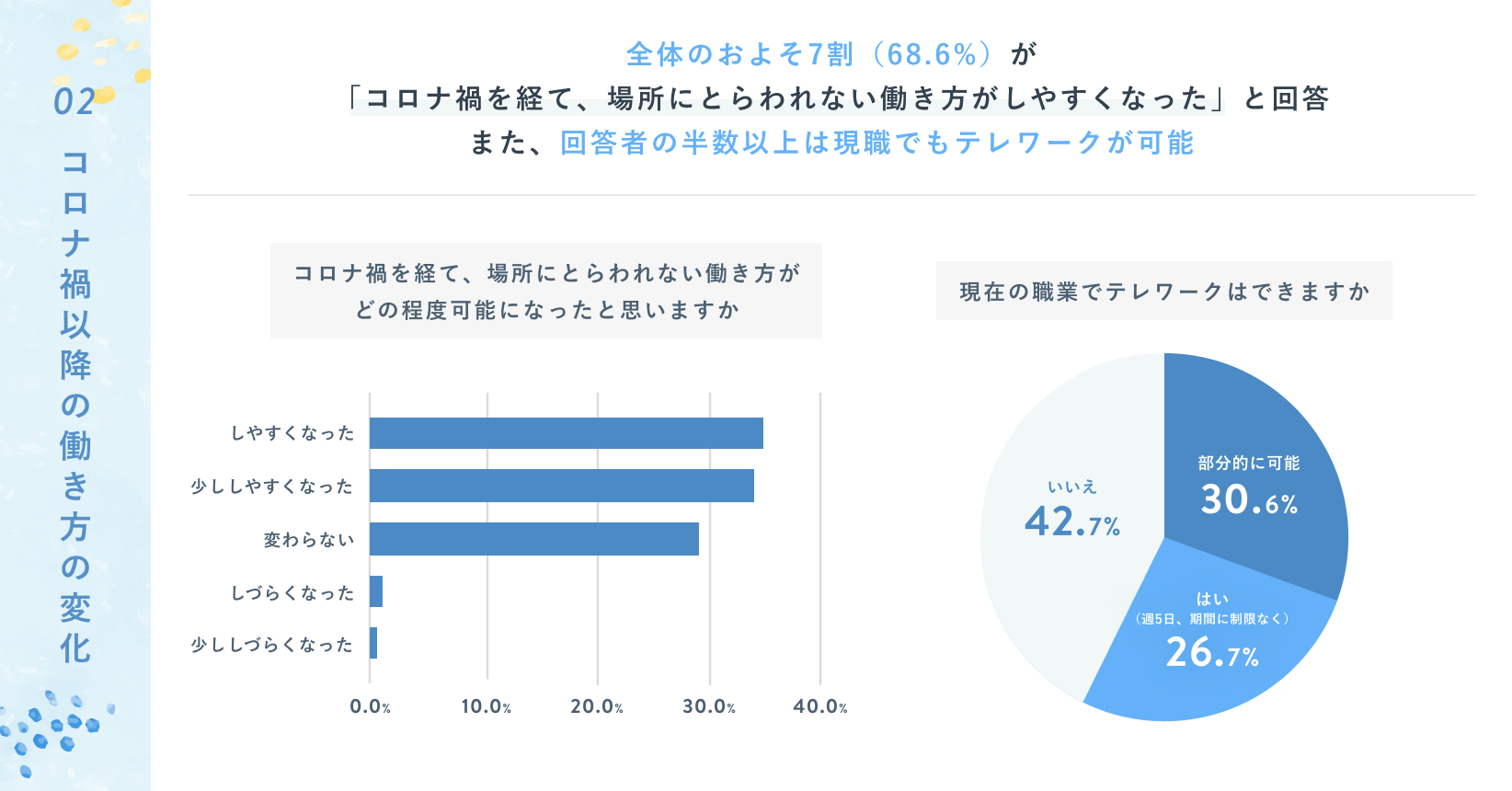 全体のおよそ7割(68.6%)が「コロナ禍を経て、場所にとらわれない働き方がしやすくなった」と回答。回答者の半数以上(57.3%)は現職でもテレワークが可能で、26.7%は週5日など期間に制限なく実施できているという結果でした。