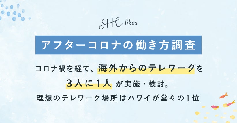 累計6万人が受講する女性向けキャリアスクール「SHElikes(シーライクス)」をはじめ、ミレニアル世代向けコミュニティブランドを展開するSHE株式会社(本社:東京都港区、代表取締役CEO/CCO:福田恵里、以下SHE)は、コロナ禍以降のテレワークに関する意識調査を実施しました。調査結果は以下の通りです。