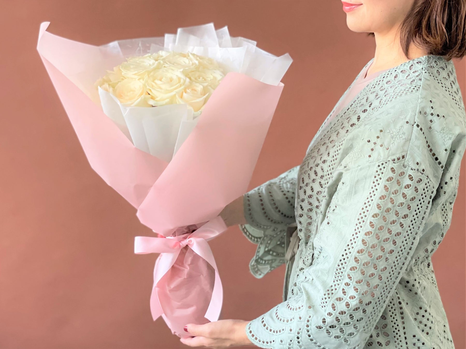 エクリュ(生成り)カラーのバラを組み合わせたロマンティックなブーケはホワイトデーにピッタリなブーケです。