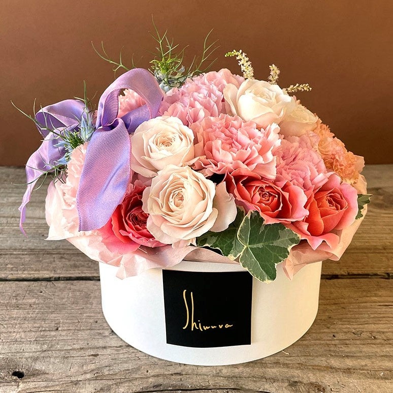 2022年9月からスタートした第一園芸のブランド「Noriko Shimura」の新作。円柱型のギフトボックスに、まるでマカロンのような甘い色合いの花をたっぷりと詰めた、気持ちが伝わるアレンジメントです。