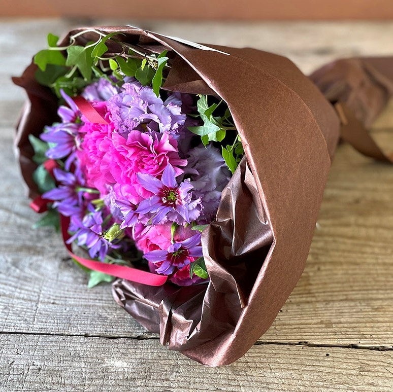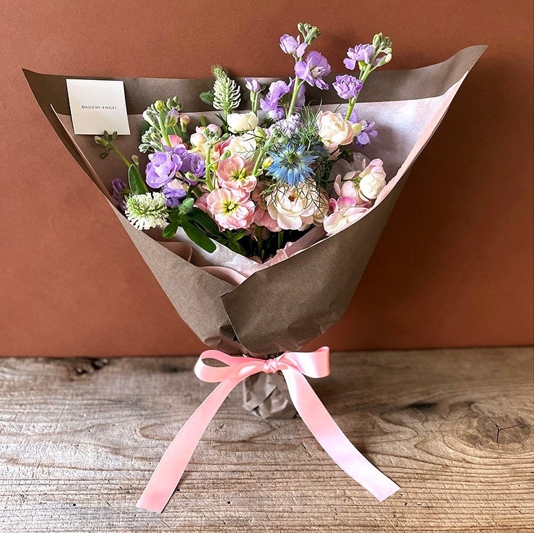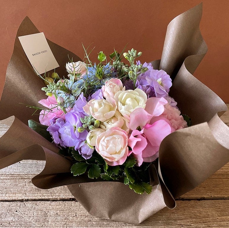 季節感あふれる旬の花々を使用し、優しいパープルからピンクのパウダリーな色合わせで作った花束。