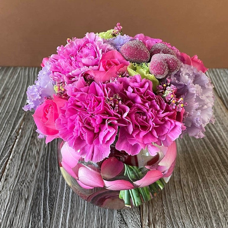 mon amour「私の愛する人」と名付けたブーケは、幸福に満ち溢れた気分にするピンクと神秘的な魅力が人気のパープルを合わせました。