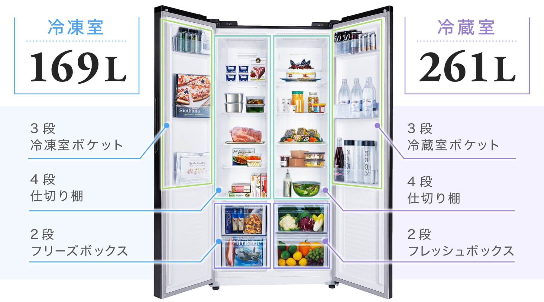 430Lで3~4人家族に十分な容量です。特に169Lとたっぷり保存できる大型な冷凍室は、まとめ買いした食材や冷凍食品の保存がしやすく便利です。また、庫内収納はシンプルなため、使い方のアイデアが広がります。
