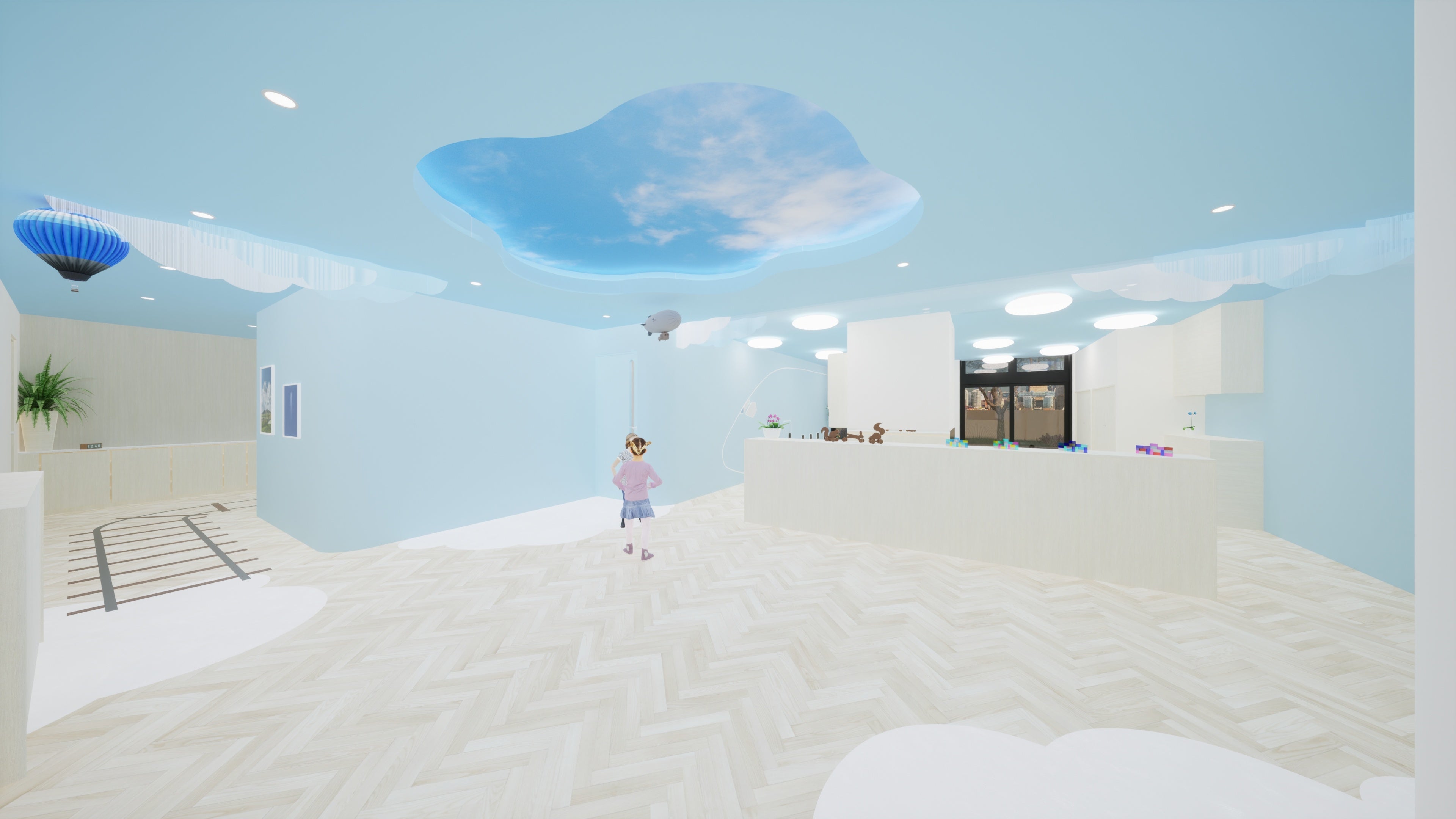 未来を象徴する保育園として、内装デザインは「空」をコンセプトに、室内全体の壁や天井にはどこまでも広がる空が描かれ、保育室に加えてお子様がのびのびと過ごせるピアッツァ(広場)や、キッチン前には食育にも使える広々としたランチホール(ダイニング)も備えています。また、保護者様が活用できるコワーキングスペースも設置予定です。