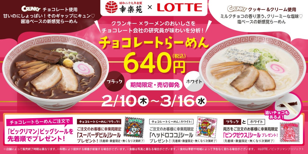 幸楽苑×ロッテ チョコレート研究員お墨付き!幸楽苑の「チョコレートらーめん ブラック・ホワイト」ビックリマンコラボで今年も期間限定販売