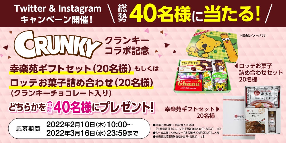 幸楽苑×ロッテコラボ記念「チョコレートらーめん」 Twitter & Instagram キャンペーンでは、ご応募いただいた方の中から、抽選でロッテお菓子詰め合わせセットを20名様、もしくは幸楽苑ギフトセットを20名様、どちらかを合計40名様にプレゼントします。