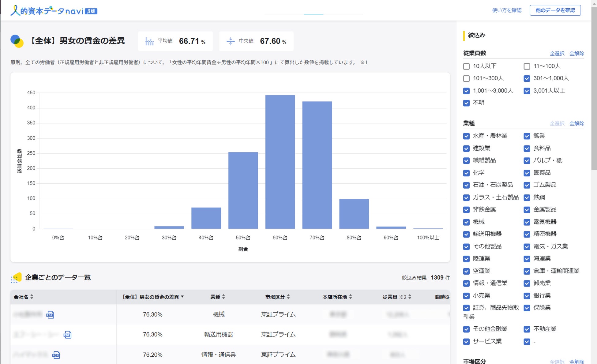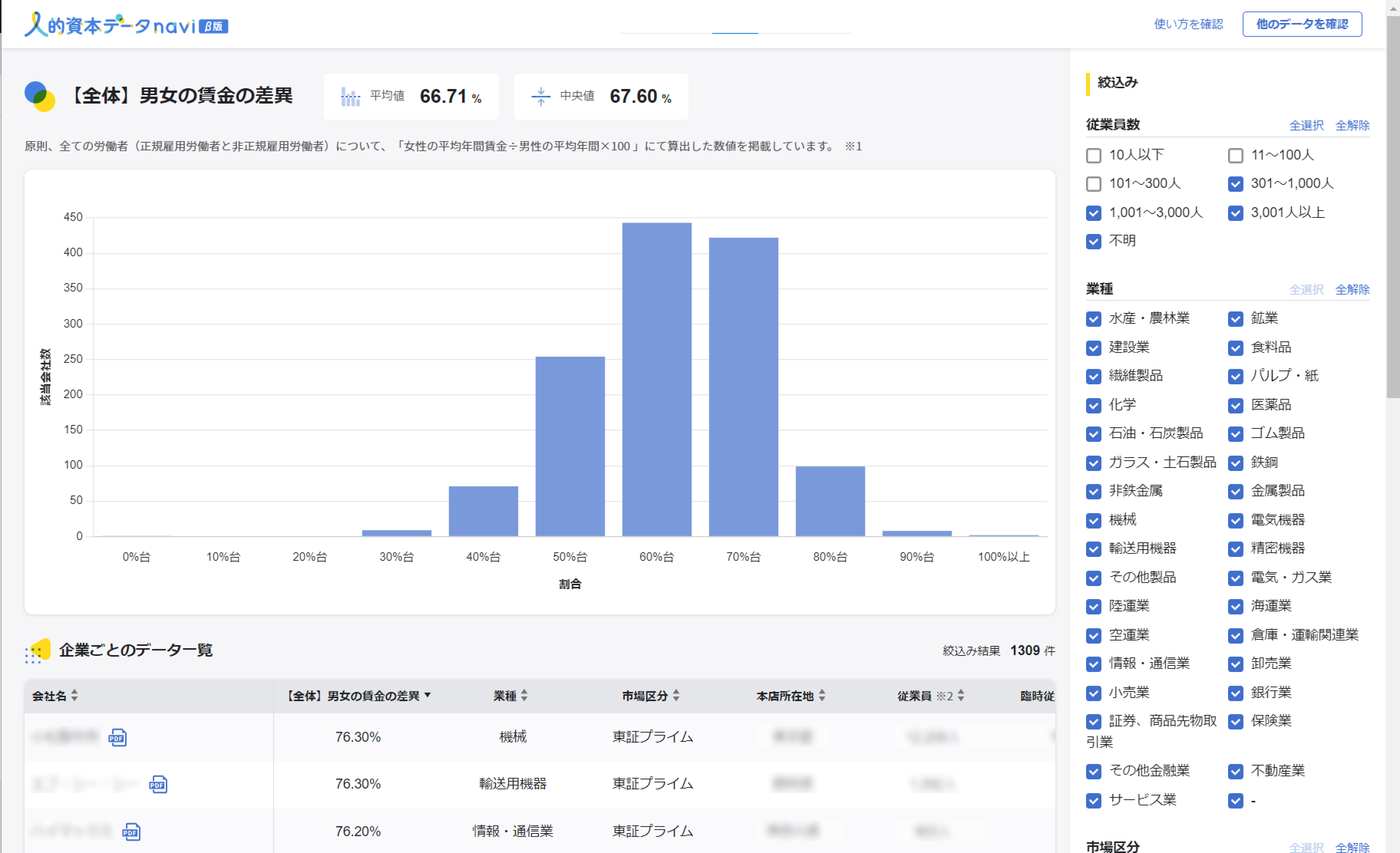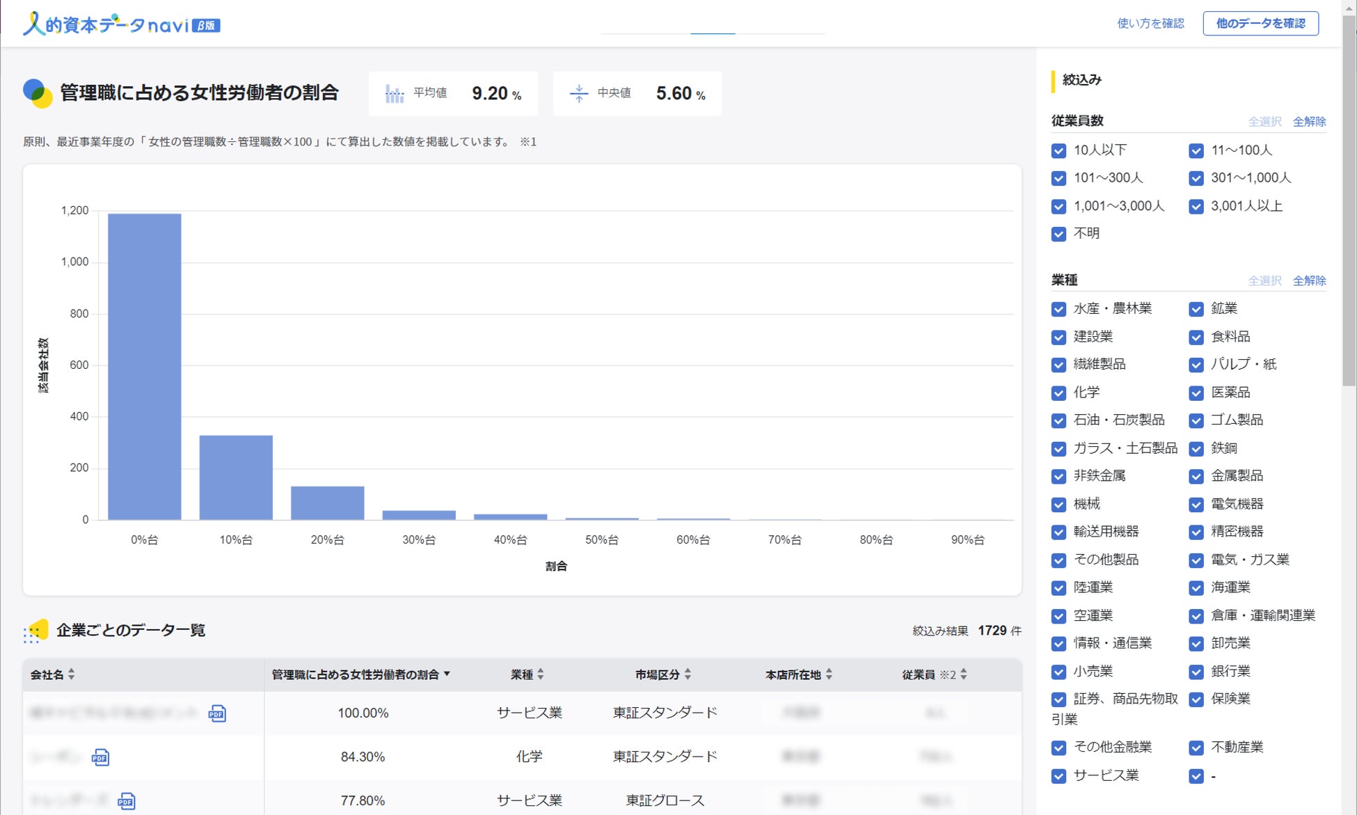 本サービスを活用することで、各社の女性管理職比率や男性の育児休業取得率、男女間賃金格差などの数値を棒グラフや一覧で確認できます。また、従業員数別・業種別・エリア別に絞り込めるため、人的資本経営のKPIを設定する際など、参考にしていただけます。