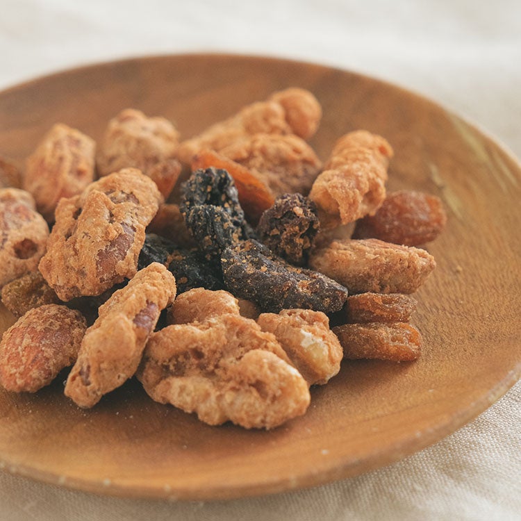 ドライフルーツやくるみをキャラメリゼしたミックス。弱火で少量ずつ加熱したことで、メープルシロップがナッツの1つ1つに甘く絡んでいます。