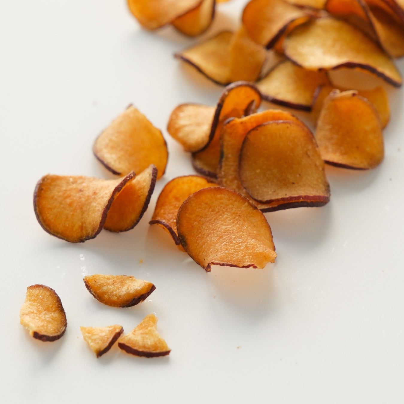 濃厚な甘みを持つさつまいも「紅はるか」、時期により「金時芋」を使用しています。味付けにはコクとうまみのある種子島産の粗糖を使用し、塩でキリッと引き締めました。揚げ油に使用しているこめ油は国産米ぬかから作られており、抗酸化物質を含みます。さつまいもの下処理から手揚げまでひとつひとつ丁寧に手作業で作られているおやつです。