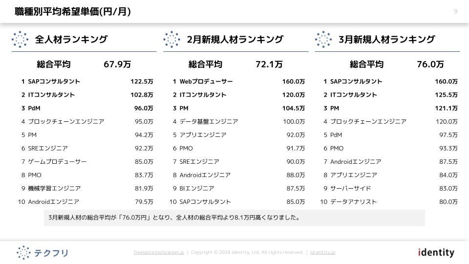 3月新規人材の総合平均が「76.0万円」となり、全人材の総合平均より8.1万円高くなりました。