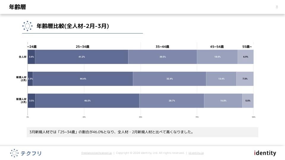 3月新規人材では「25~34歳」の割合が46.0%となり、全人材・2月新規人材と比べて高くなりました。