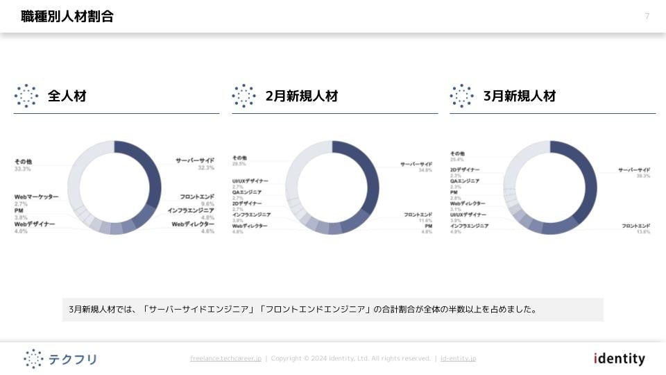 3月新規人材では、「サーバーサイドエンジニア」「フロントエンドエンジニア」の合計割合が全体の半数以上を占めました。