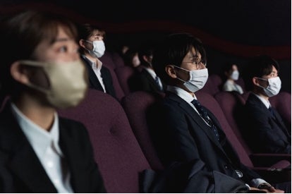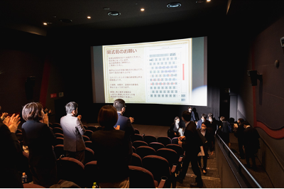当社の入社式は、本社オフィスに集められた新卒社員9名を式会場までサプライズでリムジン送迎することから始まります。何も知らない状態の新入社員が到着したのは、お台場にある映画館です。社会的距離を保ちやすく、換気も定期的になされているという観点から、感染対策に適した場所としてこの会場が選ばれました。