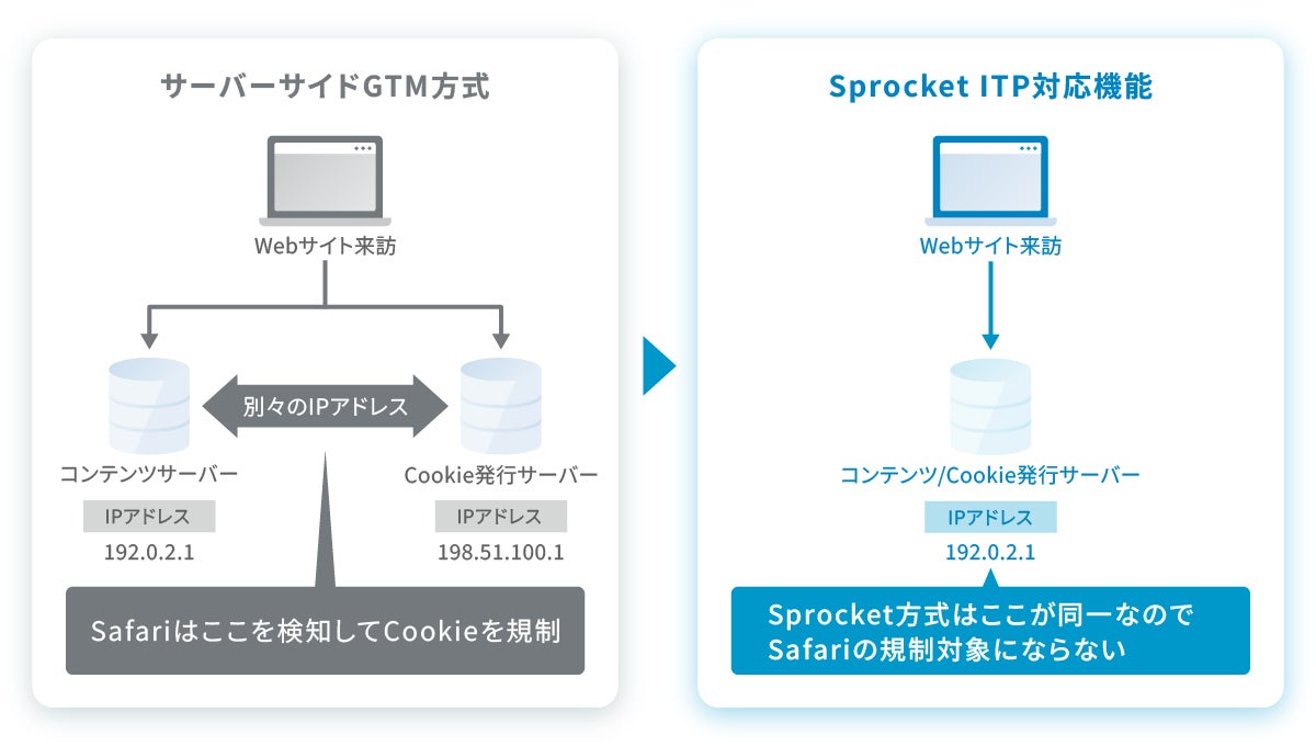 SprocketのITP対応機能は、同一のIPアドレスを持つサーバーからのCookie発行となります。そのため、サーバーサイドGTM(※)などに対するサーバーサイドCookie規制も回避することができます。