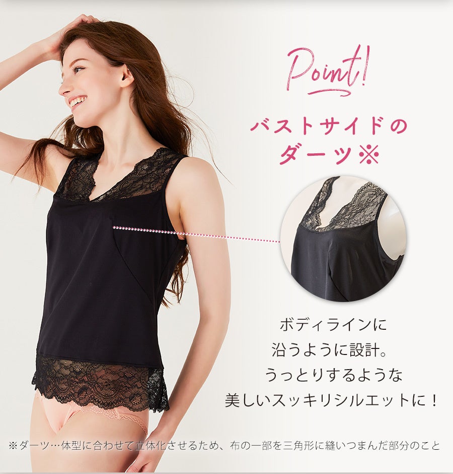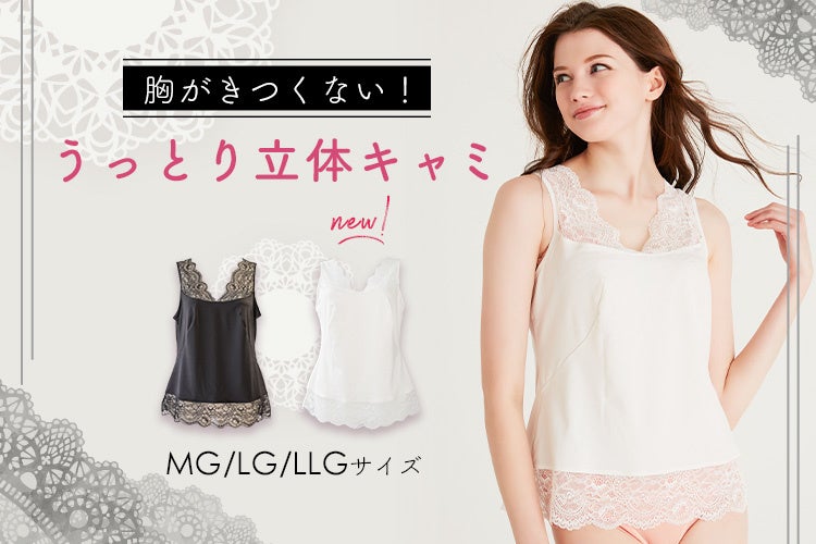 ウエストに合わせるとバストがきつい。ウエスト部分がもたついて太って見える。ボディラインをきれいに魅せるブラジャーを作ってきた私たちが、そんな困りごとを解決するために開発したキャミソールです。