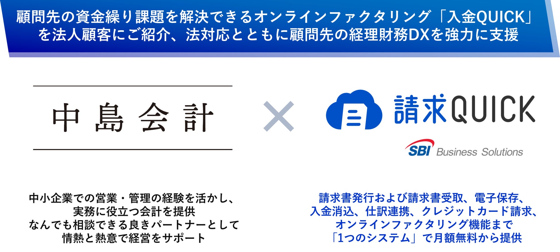 総合フィンテックソリューション企業であるSBI FinTech Solutions株式会社の子会社で、バックオフィス支援サービスを提供するSBIビジネス・ソリューションズ株式会社(本社:東京都港区、代表取締役社長:夏川 雅貴、以下「当社」)は、経理のさまざまな課題を解決し、DXを加速するクラウド型請求書管理システム「請求QUICK」におけるパートナープログラムにおいて、中島康貴公認会計士税理士事務所(本社:長野県上田市、代表社員 税理士:中島 康貴、以下「中島会計」)にご参加いただきましたのでお知らせいたします。