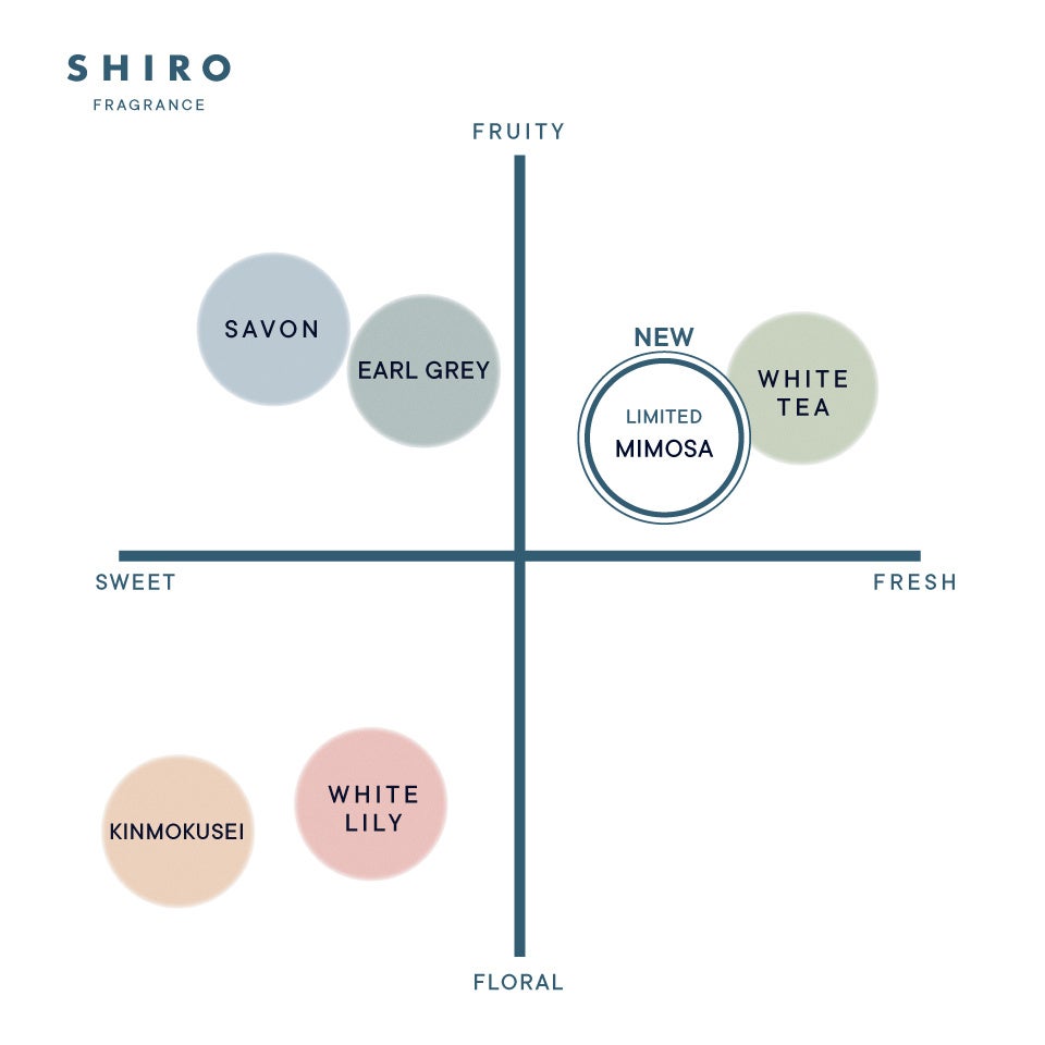 ※2 これまで『ミモザ』に使用していた香料 「リリアール」 が国際香粧品香料協会の規制によって、香料の使用制限が変更になりました。リリアールにはアレルゲンとなる可能性が報告されましたが、SHIROの製品において、この香料が原因の健康被害などの症例報告は受けておりません。