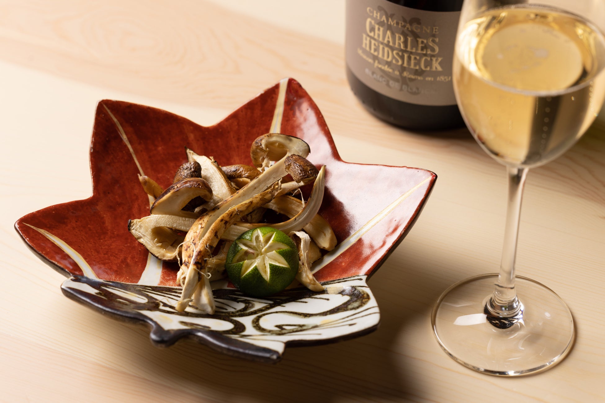秋の恵みを堪能できる松茸懐石に合わせて、日本酒とワインでペアリングを提供します。焼物には、原酒でありながらアルコールを抑えた造りが特徴の日本酒「十六代九郎右衛門 山廃純米原酒」を合わせます。なめらかで軽快な酸味が松茸の香りや風味を引き立て、山廃仕込みならではの奥行きある旨味は松茸の味わいとよく合います。さらに、紅葉鍋には柔らかな酸と程よい渋みのあるワイン「Terre de ciel Pinot Noir 2021」を用意します。鹿肉と豊かな果実味の相性や、鹿出汁を使った鍋地と樽熟成のスモーキーな香りの調和も楽しめます。